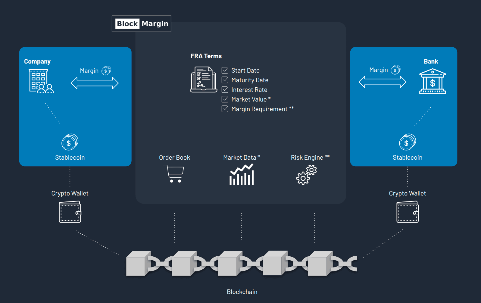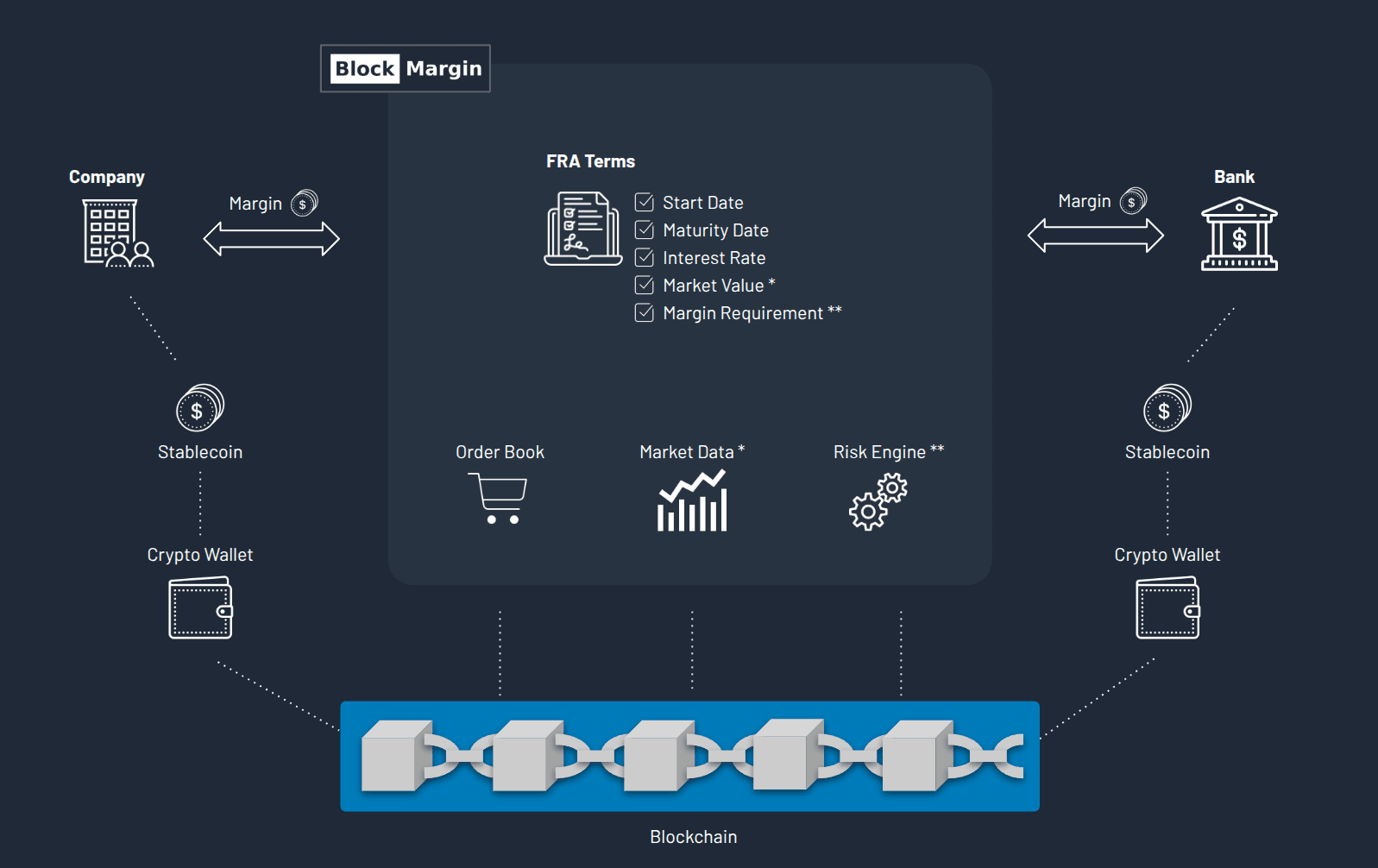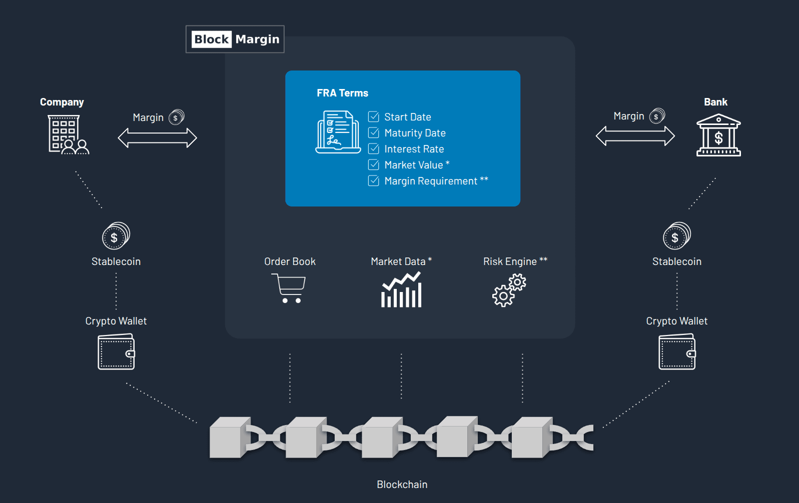 Stablecoins enable margin and settlement payments to move instantly across the blockchain, 24/7. By replacing slow banking transfers with programmable digital currency, BlockMargin reduces liquidity costs and makes daily margining seamless and affordable — giving companies access to tighter spreads and fairer pricing in the FRA market.